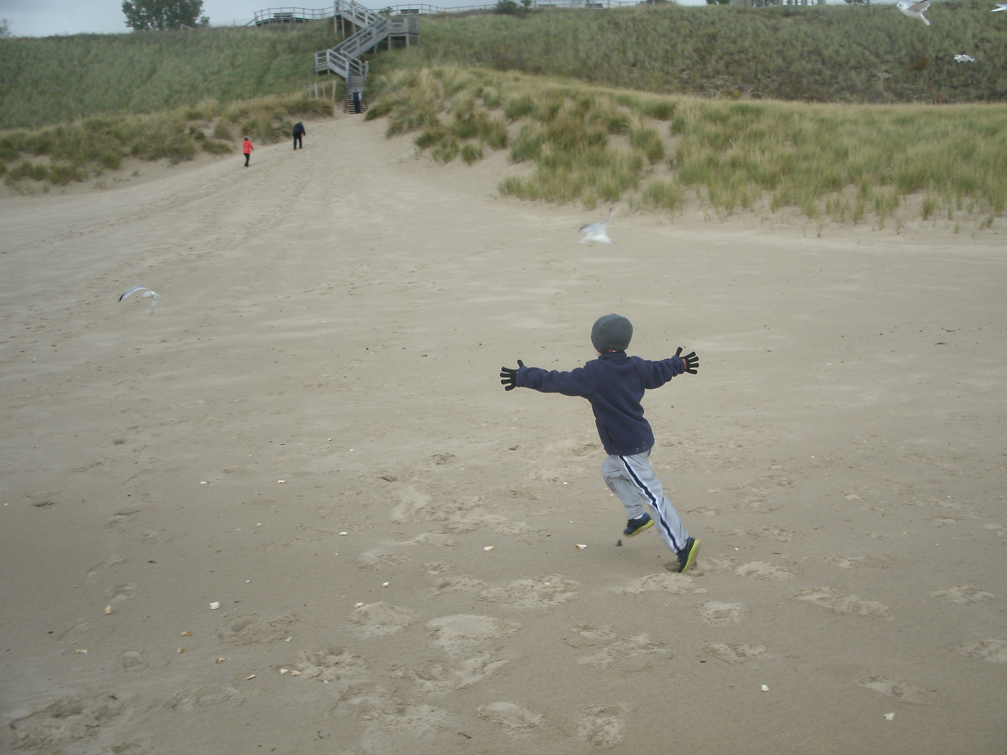 Grandpa Crandell, Uncle Chris and Uncle Eric came to visit for a weekend of fun. We celebrated Chris’ 30th Birthday early. The kids loved showing them around town. We went to Lake Michigan (Tunnel Park) and fed the seagulls. Cooper was such a beach boy- he was loving it. Bella…. not so much. The kids loved watching the boys play football, soccer, driving remote control planes and boats. Uncle Chris brought Bella 2 fairy dolls and Cooper a remote control boat- they of course were very excited.